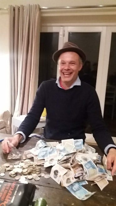 The trip to Waverton was a blast, and as I drove back home, with my phone filled with thankful messages from teachers and headteachers and parents whose child had already read one hundred pages of my book, I had that drunken, elated feeling that the middle-aged man so infrequently knows: I felt I’d done a good day’s work. I’d got a cheque for 500 quid, and a glass paperweight prize, and I’d sold at least six hundred quid’s worth of books. As I careered through the front door of home, bank notes were spilling from the pockets of my dirty suit, as if I was very exuberant tramp, who’d just done remarkably well on the horses. Here I am, counting up the takings, photographed by one of the girls…