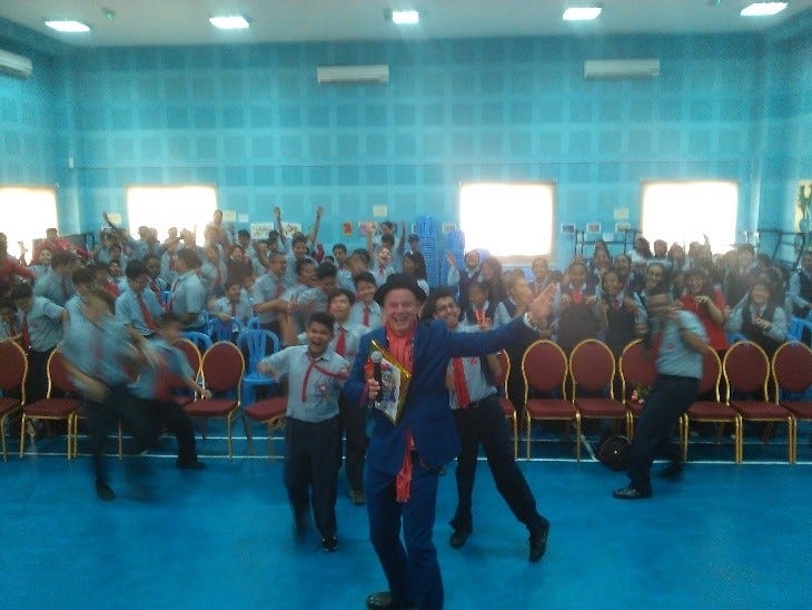See… I’m rubbish at pretty much everything, but as a provider of entertaining Author Visits, I’m pretty much unmatched. I do a funny show called The Seven Secrets of Storytelling, which I’ve done, all over the world. It makes kids laugh, and then gets them to make up their own stories, and then gets them to write. This is me, just finishing up, in The Apple School in the United Arab Emirates.